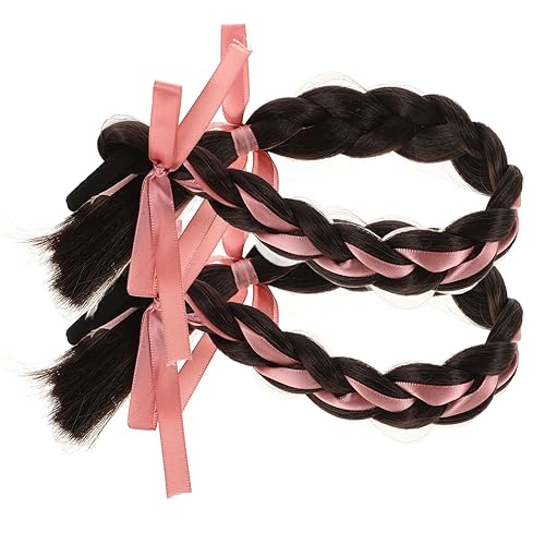 Homoyoyo 2pcs Braided Ponytail Extensions for Women Bubble Hairpiece with Pink Ribbon Deep Brown Synthetic Wig for Parties Cosplay Festivals and Daily Wear