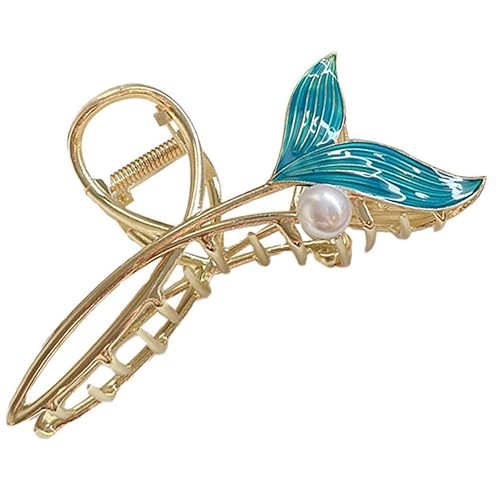 Large Blue Pearl Metal Fishtail Claw Clip for Women Alloy Hair Jaw Clip for Thick Hair Non-slip Decorative Styling Accessory for Parties Daily Wear and Banquets