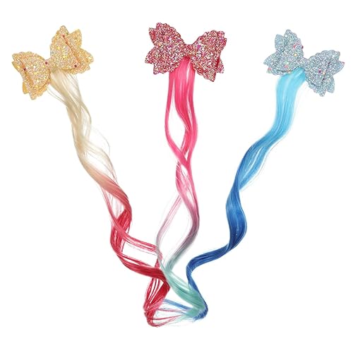3pcs Colored Hairpiece Clips with Glittered Bow Barrettes Synthetic Hair Extensions Comfortable and Gentle for Play and Party Decoration