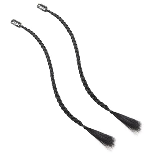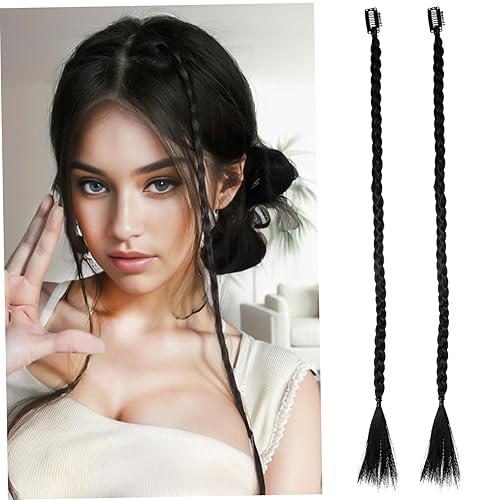2Pcs Synthetic Braided Hair Extensions Clip In Side Bangs Long Ponytail Piece for Women Easy to Style Natural Black Braided Wigs for Cosplay Parties Halloween and Daily Wear