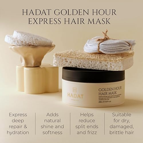 HADAT Golden Hour Express HAIR MASK – Premium Professional Hair Treatment with Pearl Powder – Hydration for Dry Damaged Hair – Nourishing Oils – Split Ends – Salon Quality – Made in Israel, 9.47 Fl Oz
