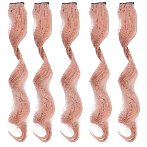 5Pcs Highlights Hair Extension, High Temperature Synthetic Hair Hairpiece with Clip, Long Curly Colored Clip In Hairpiece for Party (Pink)(Aoki Ash)