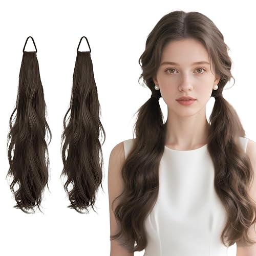 Curly Ponytail Extension with Hair Tie 2PCS 17 Inch Natural Wig Elastic Band Wave Fake Ponytail Wigs Accessories for Women Daily Wear (Black)(Brown)