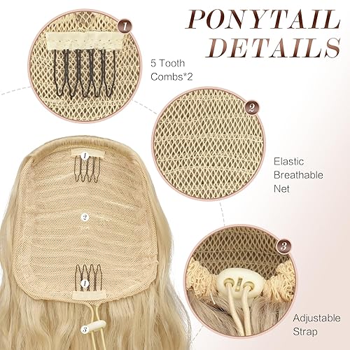 FESHFEN Ponytail Extensions - 26 inch Drawstring Long Curly Wavy Clip in Ponytails Synthetic Hair Piece Pony Tail Hairpieces for Women, Black Highlighted Caramel(24/88# Blonde,26 Inch)