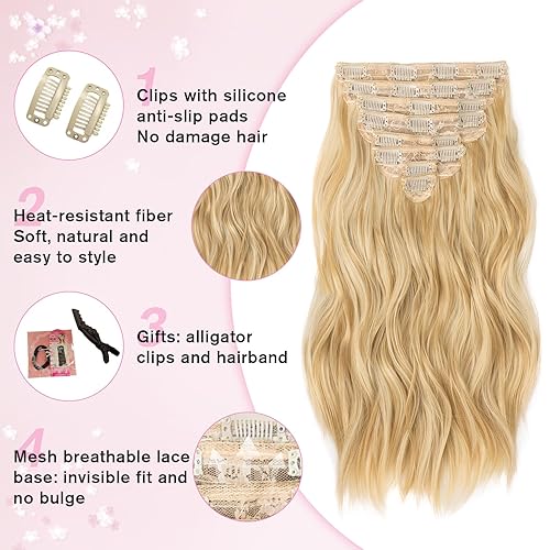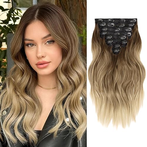 Hair Extensions Clip Ins, 8PCS 20 Inch Wavy Dark Brown Mix Light Brown Clip in Hair Extensions, Synthetic Lace Weft Hairpieces for Women Daily Party Use(Honey Blonde Mixed Beach Blonde,16 Inch (8PCS))