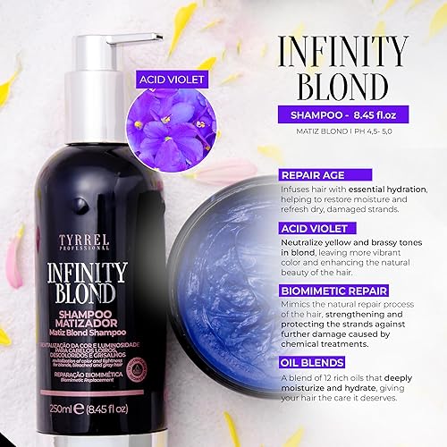 Infinity Blond Home Care Toning Shampoo 8.45 fl oz – Neutralizes Yellow Tones, Protects Alpha-Keratin, and Enhances Brightness in Blonde, Bleached, and Gray Hair – Camellia Flower Scent – Tyrrel