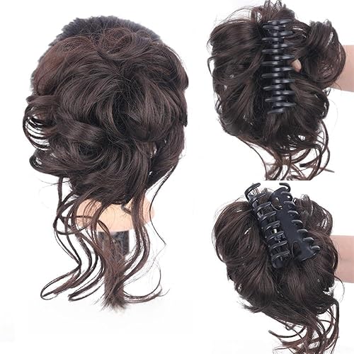 Messy Hair Bun Claw Clip Messy Bun Hair Piece Wavy Curly Hair Chignon Tousled Updo Synthetic Hair Extensions Ponytail Hairpiece for Daily Wear(Dark Brown)(Dark Brown)