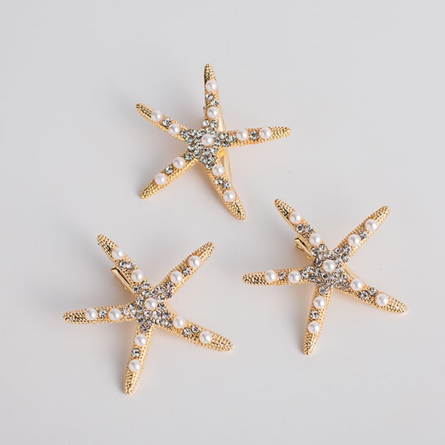 VERSATILE SET: Includes elegant gold starfish hair clips adorned with pearls and crystals, plus cherry-shaped clips with red crystals and green leaf accents