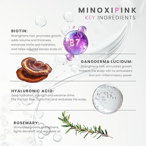 Anti-Aging Protection for Hair & Scalp – Enriched with Ganoderma Lucidum (Reishi Mushroom) and Antioxidants, MinoxiPink shields hair from free radical damage, hormonal thinning, and environmental stress, helping maintain youthful, vibrant, and voluminous hair.
