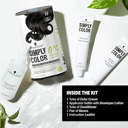 Schwarzkopf Simply Color Hair Color 1.0 Jet Black, 1 Application - Permanent Hair Dye for Healthy Looking Hair without Ammonia or Silicone, Dermatologist Tested, No PPD & PTD (Pack of 2)
